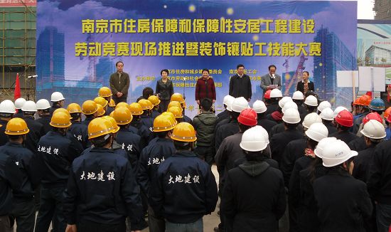 11月22日由南京市總工會(huì)、南京市人力資源和社會(huì)保障局、共青團(tuán)南京市委員會(huì)主辦、南京市住建委、南京市城建工會(huì)、保障房建設(shè)指揮部承辦的南京市住房保障和保障性安居工程建設(shè)勞動(dòng)競賽現(xiàn)場推進(jìn)暨裝飾鑲貼工技能競賽活動(dòng)在股份公司丁家莊匯杰02地塊項(xiàng)目部隆重舉行。02地塊項(xiàng)目經(jīng)理?xiàng)钜婷袷芄煞莨窘忻骺偨?jīng)理的委托,代表保障房承建單位發(fā)言,他在發(fā)言中表示:保障房建設(shè)是南京市貫徹落實(shí)國家關(guān)注民生要求的重要工程,一定要全力以赴不折不扣地按照保障房指揮部的要求,積極投身保障房勞動(dòng)競賽活動(dòng),加大人力、財(cái)力以及科技力量的投入,不遺余力狠抓工程質(zhì)量、工程進(jìn)度和安全管理,努力加快推進(jìn)保障房建設(shè)的步伐”。并代表項(xiàng)目部承諾:“遵循用大地人的勤奮營造大地精品的管理理念建造讓南京市人民放心的保障房”。