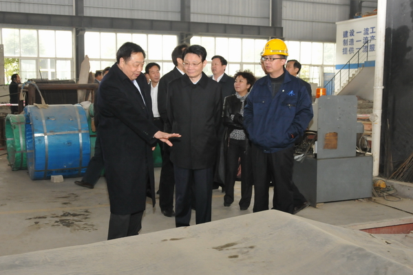 何權副省長一行參觀了我公司新型建筑工業化產品生產基地—— “大地工業園”,并聽取了我集團公司董事長兼總裁于國家,副總裁兼總工程師劉亞非,關于公司多元化發展以來所取得的各項成果介紹。劉亞非總工著重介紹了我公司以生產綠色、節能、環保、低碳的新型建材為導向的建筑工業化發展情況。