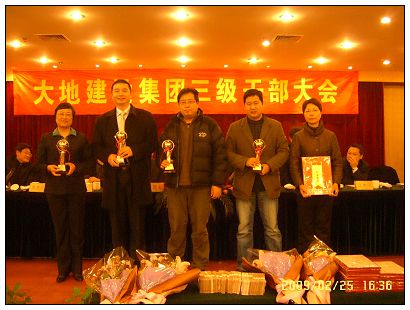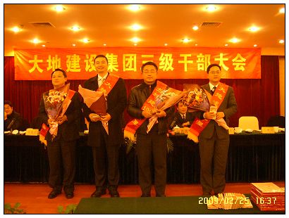 緊接著大會進行第二項議程,對部分干部人事任免進行宣讀。隨著高亢激揚的音樂聲中,大會順利進入到了第三項議程,對08年度的最佳團隊、先進處室、大地之星、最佳個人等榮譽稱號獲得者進行現場表彰。緊接著大會緊張有序地進行著第四項議程。于國家同志代表公司與各基層負責人簽經營責任目標書,陳慶生同志代表黨委與各基層黨支部書記簽黨建工作責任書,鄒志堅同志與基層負責人簽安全生產責任書,股份公司總經理江中明同志、黨委書記楊如明同志也分別與股份所屬基層負責人簽經營、黨建工作責任書。